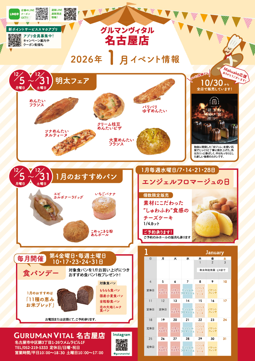 2025年12月26日 15:07 お知らせ 【名古屋店】2026年1月のイベント情報 こんにちは。 名古屋店の1月のイベント情報をお知らせします。 イベントチラシの画像は、下記の画像をタップすると大きく表示されます。 前の記事へ 次の記事へ