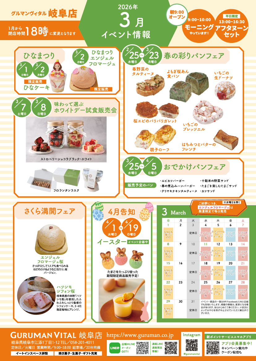 2026年02月26日 13:58 お知らせ 【岐阜店】2026年3月のイベント情報 こんにちは。 岐阜店の3月のイベント情報をお知らせします。 イベントチラシの画像は、下記の画像をタップすると大きく表示されます。 前の記事へ 次の記事へ