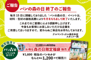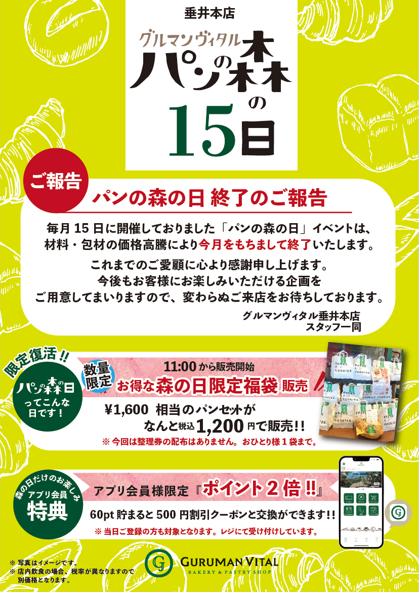2025年12月01日 12:18 お知らせ 【垂井本店】2025年12月15日をもってパンの森の日が終了いたします。 【垂井本店】 パンの森の日についてのお知らせ- ̗̀📣 毎月15日に開催しておりました 【パンの森の日】イベントは 今月の開催をもちまして終了いたします。 今までご愛顧頂き誠にありがとうございます。 ご迷惑をおかけしますがご理解の程よろしくお願いいたします🙇♀️ 前の記事へ